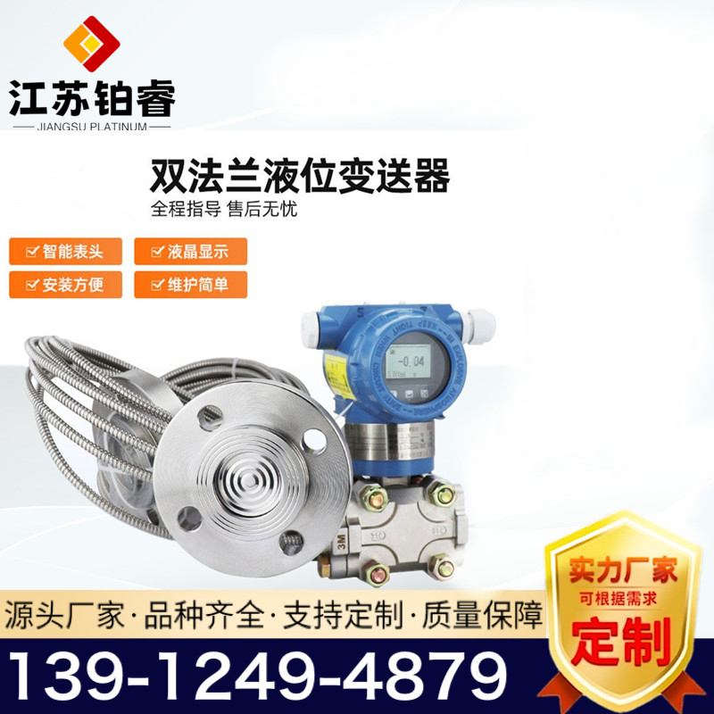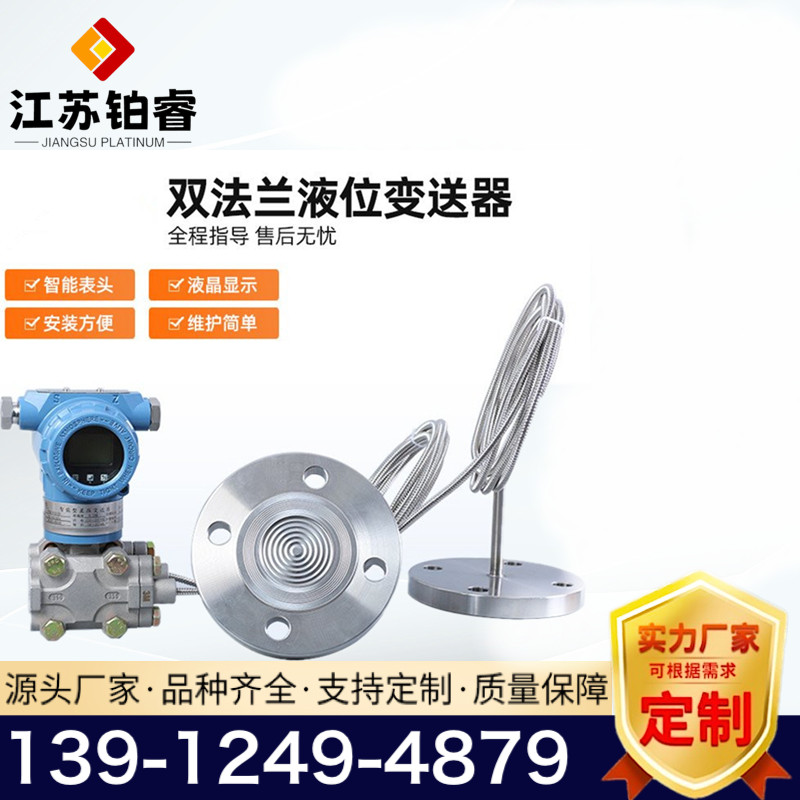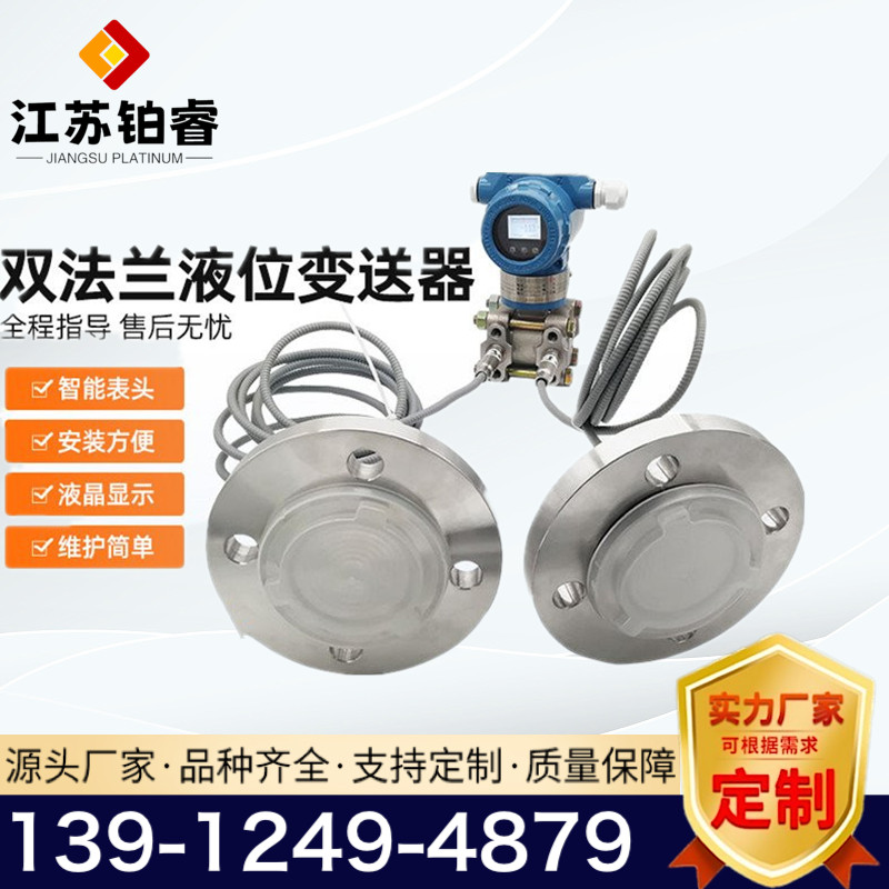 雙法蘭液位變送器,實質(zhì)上是一種特殊取壓的差壓變送器。它是在差壓變送器正、負室取壓口上接上二條紫銅毛細管,末端是兩個用不銹鋼膜片封閉的、固定在安裝法蘭上的膜盒。膜盒與毛細管和差壓變送器正、負壓室,內(nèi)部采用真空充填方法充硅油,而它們之間則用外套螺母、接管和接頭緊密聯(lián)接起來。這樣,在測量液位時,通過感壓膜盒上的不銹鋼波紋膜片感測的壓力,由硅油傳遞至差壓變送器的正、負壓室。此后的位移、轉(zhuǎn)換等則完全與差壓變送器相同,故不再重復。