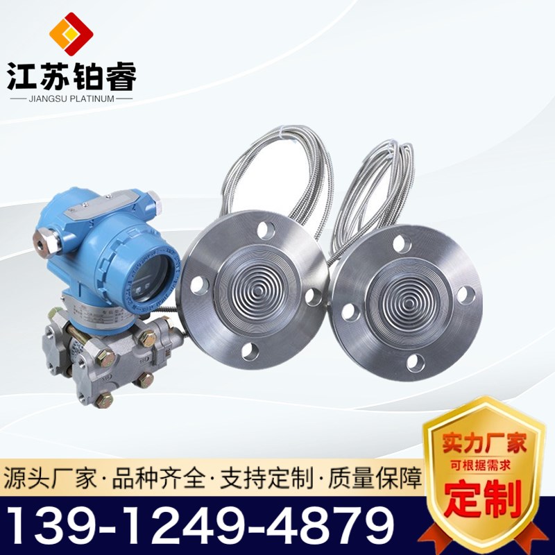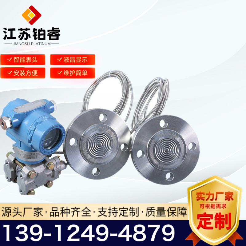 雙法蘭液位變送器,實質(zhì)上是一種特殊取壓的差壓變送器。它是在差壓變送器正、負室取壓口上接上二條紫銅毛細管,末端是兩個用不銹鋼膜片封閉的、固定在安裝法蘭上的膜盒。膜盒與毛細管和差壓變送器正、負壓室,內(nèi)部采用真空充填方法充硅油,而它們之間則用外套螺母、接管和接頭緊密聯(lián)接起來。這樣,在測量液位時,通過感壓膜盒上的